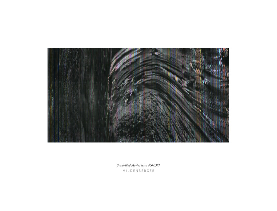 Für den experimentellen Aufbau wird eine Glasplatte auf den Bildschirm eines um 90° geneigten Monitors gelegt. Während der Film „Jesus“ (John Krish, Peter Sykes, 1979) läuft, wird der Bildschirm kontinuierlich mit einem mobilen Scanner gescannt. Der performative Scanprozess erfolgt ohne Unterbrechung, bis der gesamte Film eingescannt ist. In der Videoanimation SCANTRIFIED MOVIE: JESUS werden die Scans als ein Band animiert, das sich von rechts nach links bewegt, gezeigt. Die Dauer des Videos entspricht der Laufzeit des Originalfilms von 128 Minuten. Der Originalton des Films „Jesus“ wird mithilfe eines Synthesizers in atmosphärische Klänge transformiert und dem Video hinzugefügt.